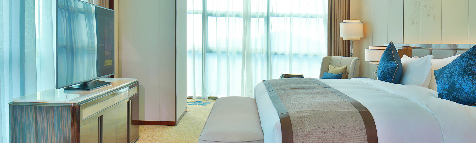 大使套房智能化配套设施齐备、空间宽敞,拥有独立的起居室、卧室、小型会议室,以及豪华浴室与独立化妆间,让您在高科技的氛围中尽享奢华。更可享受行政酒廊礼遇。