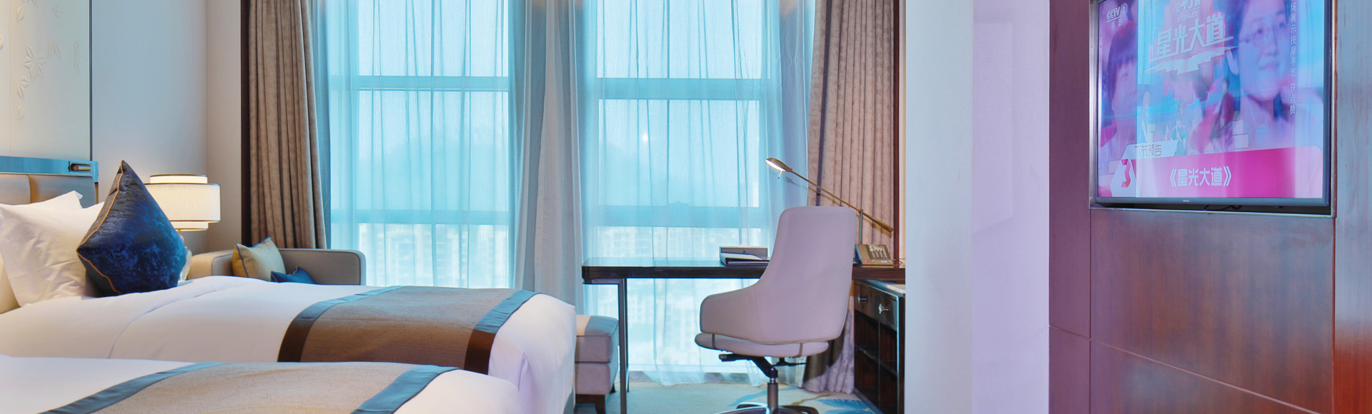 豪华双床房宽敞奢华,令人神往,智能化配套设施齐备,为您提供一张大床,以及充满活力的城市景观。